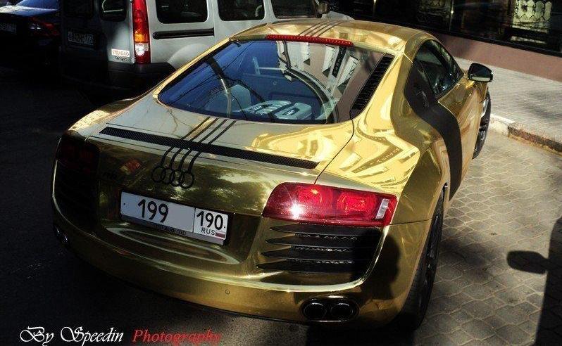 Сега се появи още едно руско возило със златен цвят. Този пък колата е Audi и поне според информацията покритието й не съдържа особено голямо количество от ценния благороден метал. Возилото е оборудвано с по-малкия V8 двигател и е заснето в столицата Москва.
