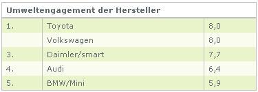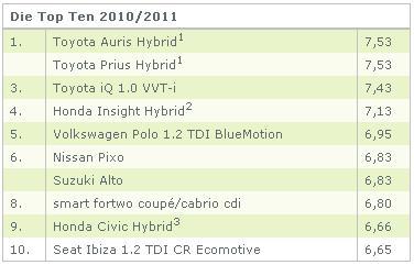 "Хибридният Auris e победител в компактния клас, а Toyota Prius оглавява класацията при семейните автомобили", съобщават от японската компания, като поясняват, че всички останали возила в челната десетка са малки или много малки автомобили, както и 2 хибрида.