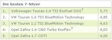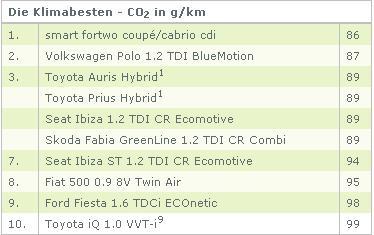 Хибридите на Toyota с аналогична технология - Auris HSD и Prius (победителят в миналогодишната класация) получават 7.53 точки, като заемат първите две места в класирането. Бронзов медалист е отново автомобил на Toyota - IQ 1.0 VVT-i, който записва 7.43 точки в актива си.