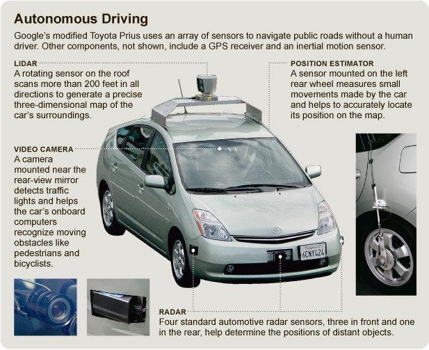 Автомобилите-роботи на Google разполагат със следните компоненти: 1. На покрива на автомобила има лазерен сензор, който сканира обстановката. Лазерните лъчи постоянно измерват отстоянието на различни обекти в радиус от 70 метра, с точност до сантиметър.
