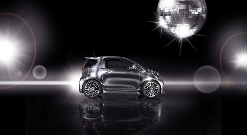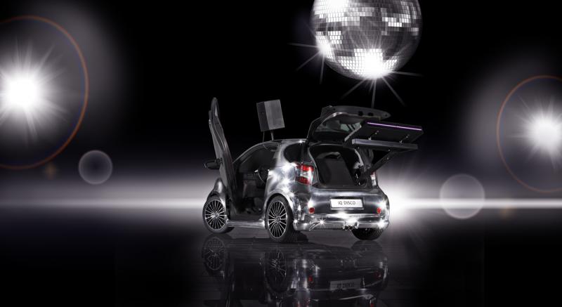 Мини колата на Toyota е покрита със специално фолио с огледален ефект, отварящи се нагоре врати и 18-инчови колела. Освен, че прилича на диско топка Toyota iQ Disco притежава и всички необходими DJ атрибути.