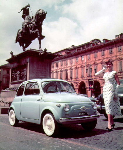Точно на 4 юли 1957 г. на света е представено първото поколение на Fiat 500. Той е с двуцилиндров двигател с въздушно охлаждане и работен обем 479 см3, като максималната му мощност е 10 kW (13 к.с.). Скоростната кутия е четиристепенна.