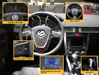 Интериора на автомобила ни дава още по-голяма увереност в нашата правота. Волана определено е на А3. На А3 е и челното стъкло. Като цяло общата архитектура на таблото при Lada-C напомня Audi. За разнообразие отделните прибори по него са взети от Volkswagen Caddy.