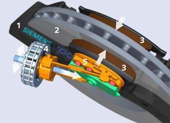 Сега инженерите в Siemens VDO използват този основен принцип в комбинация с най-съвременна технология. При новата система клинът се изтласква, така че да притисне накладките към спирачния диск. Клиновете се управляват от специален електромотор, който задейства оси, които от своя страна въздействат върху специална вълнообразна накладка. Срещу нея е разположена също така вълнообразна накладка. Между двете се вклиняват малки оси. Така възниква сила, която притиска накладките към спирачния диск.
