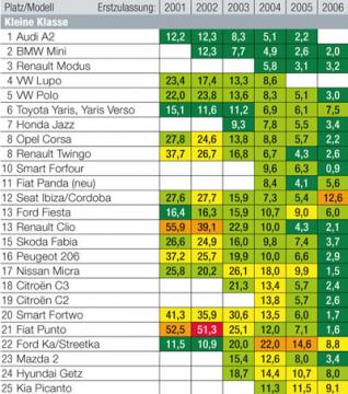 При най-малките и малките води обновения Audi А2, пред MINI на BMW и Renault Modus.