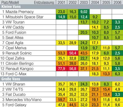 При вановете победители са Mazda Premacy и Mitsubishi Space Star пред VW Touran и Caddy. Най-малка честота на повреди през 2006-та статистиците са изчислили при Smart Forfour (0.9 повреди на 1000 автомобили от еднакъв тип, произведени в една и съща година), Opel Signum (1.0), BMW X3 и Mercedes SLK (по 1.2), както и при Fiat Punto и BMW 1 (по 1.6). Много зле се представят по-старите модели на Renault, които през последните години обаче, бяха чувствително подобрени и при по-новите са нагоре в класацията. Като най-често срещаната причина за принудителен престой на пътя ADAC посочва празния акумулатор (460 876 случая). Около половината от случаите са причинени от проблем в запалването или електрически проблеми, следват повреди в мотора (7.9% от случаите), колела и гуми (6.7%), инжекциони (6.6%), охлаждаща и затопляща системи (6.0%) и горивна система (5.9%). Трябва да се има предвид и че когато на пътя закъса например Ford Fiesta, нейният шофьор има доста по-големи шансове, а също и готовност да си помогне сам, отколкото ако шофьорът на BMW 7.