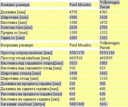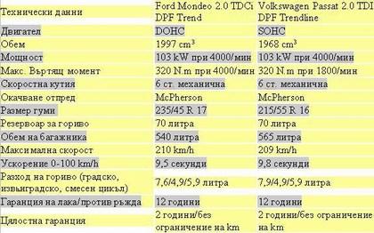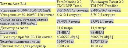 Когато стигнем до сравняване на двигателите на двата автомобила, откриваме че са доста близки по параметри. И двата модела предлагат турбодизелови агрегати с обем 2.0 литра, мощност 103 kW и максимален въртящ момент 320 N.m. При Mondeo двигателят има възможност да достигне за кратко и до 340 N.m, но поради по-високото му тегло това не се отразява на ускорението. Все още има една принципна разлика между тези двигатели – при Ford това е агрегат тип common rail, във Волфсбург все още предлагат тип помпа-дюза. Двигателят на Passat е малко по-шумен, а разхода на по-тежкия със 65 кг Ford, според производителя е същия както при Passat.