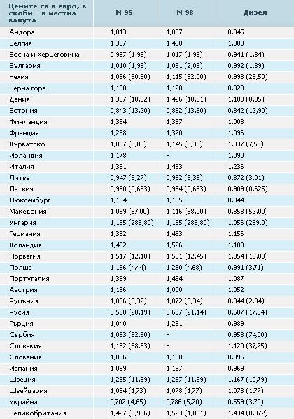Лятото е време за път. Предлагаме ви данните за цените на горивата в Европа към 3.08.2007 г., както ги съобщава Швейцарският Автомобилен клуб TCS.