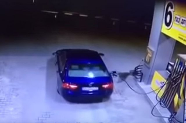 Инцидентът се е случил на 20 юни на шосето, свързващо столицата Киев и град Житомир, като е записан от охранителната камера на бензиностанцията. Ясно се вижда как мъж със синьо BMW зарежда с гориво, плаща и потегля, но забравя да извади „пистолета”, с който се пълни горивото.