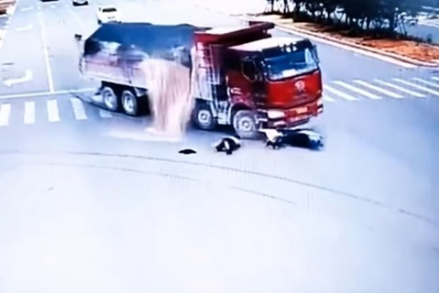 Инцидентът става, след като мотористът навлиза в кръстовището, където го уцелва първият камион, а вторият успява да намали и да свие, но и той удря късметлията. В Китай шофьорските курсове продължават една година, но местните медии коментират, че мъжът със скутера явно е отсъствал от много уроци, особено когато е трябвало да се изучават знаците.
