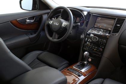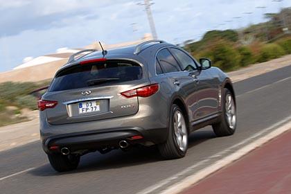 За това допринася естествено и спортното поведение на автомобила. Благодарение на използваните алуминиеви детайли FX е с около 200 кила под конкуренцията. Въпреки това теглото му е около 2 тона. Само че окачването се настройва с натискане на копче, задната ос също участва в завиването, а воланът е изключително прецизен, така че дебелакът се чувства на място и в тесни завои.