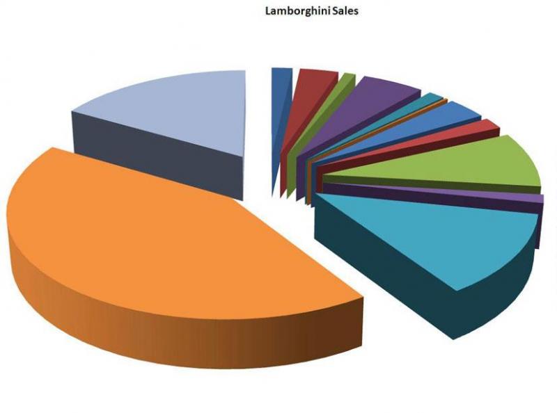 Голямото оранжево парче от "питата", показва продажбите на Gallardo (9900 боря). По-малкото сиво-синьо парче е за Murcielago (3850), а останалите парченца показват продажбите на всички вече бивши модели на Lamborghini.