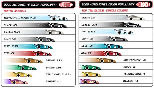 В световен мащаб класацията изглежда така: Сребрист - (25%), Черен - (23%), Бял - (16%), Сив - (13%), Син - (9%), Червен - (8%), Кафяв / бежов - (4%), Зелен - (1%), Жълт / Златист - (1%), Други - (1%).