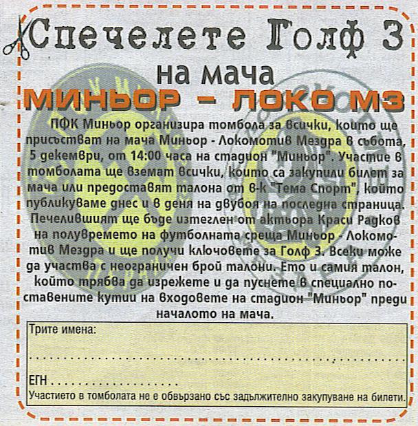 ПФК Миньор (Перник) организира томбола за всички, които ще присъстват на футболната среща Миньор - Локомотив Мездра в Перник.