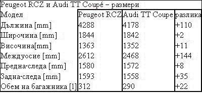 Освен това, когато се говори за практичност или не, добре е да се знае, че този автомобил използва доста от техниката на 308. Peugeot RCZ влиза в сегмент в който ще има един единствен пряк конкурент - Audi TT Coupé. Маже да се приеме, че близки до тях са и Mercedes-Benz CLC, BMW Серия -1 или дори Volkswagen Scirocco. Все пак новото Пежо (дори на външен вид) е най-близо до Audi TT, затова е интересно да сравним размерите на двата автомобила.