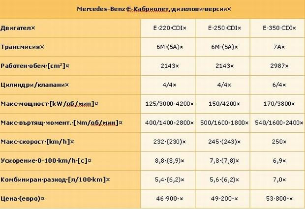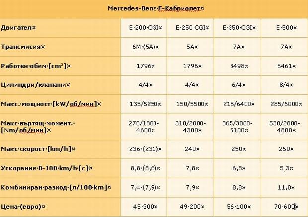 Дизеловата алтернатива е E 220 CDI с мощност 125 kW който има цена започваща от около 49 000 евро. Следващото предложение са E 250 CGI и E 250 CDI, и двата с мощност 150 kW и цена около 51 000 евро. На върха е E 500 с осемцилиндров двигател.