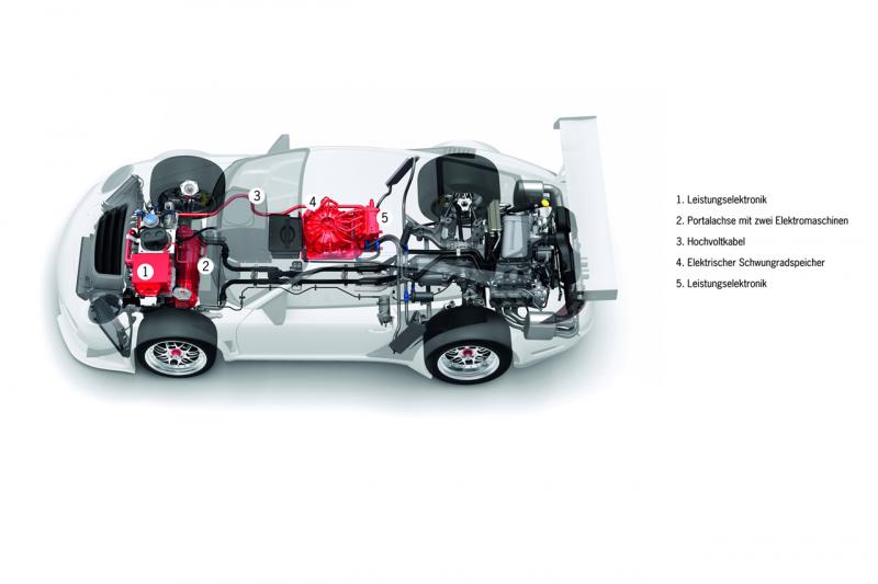Чрез натискането на бутон се доставя мощност от 160 к.с., за около 6-8 секунди, която се предава към електрическите двигатели, задвижващи предните колела. Тези двигатели подпомагат позиционираният в задната част 6-цилиндров боксер с обем 4.0-литра и мощност 480 к.с.