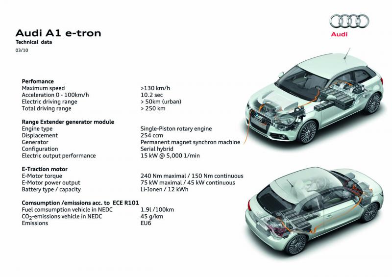 Той е достатъчно компактен, за да може да се побере под багажното отделение, задно с изпускателната, всмукателната и охлаждащата система. Двигателят е оборудван с резервоар с капацитет 12 литра, който подсигурява пробег от около 200 км. Така A1 e-tron демонстрира автономен пробег от 250 километра и средното потребление на гориво от 1.9 литра на 100 км.