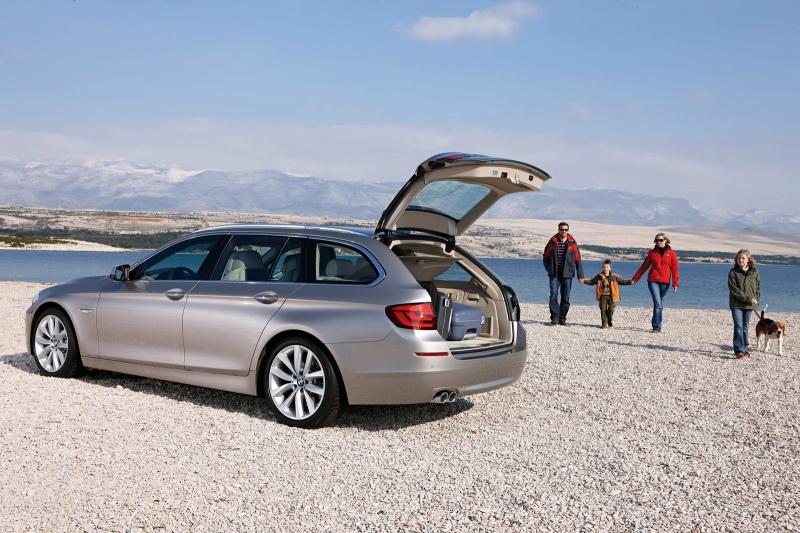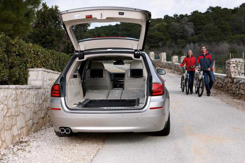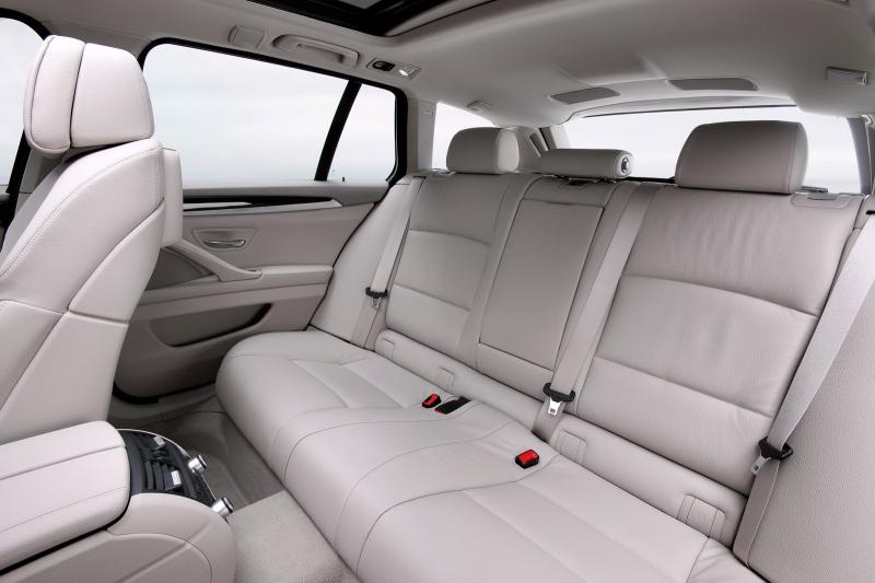 Като комби модел, новият Touring е по-практичен от всички останали членове на семейството на „петицата”: сгъваеми задни седалки (40/20/40), покривало в багажното отделение, уникално отваряне на задното стъкло, специално окачване уравновесяващо товара, релси на покрива.