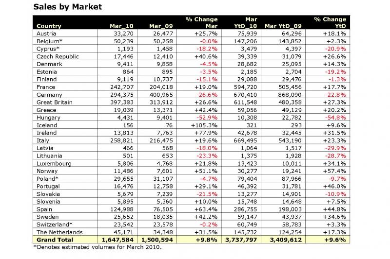 По страни, продажбите в Европа растат за първото тримесечие на годината, като изключим най-големия европейски пазар, Германия, където след края на програмата за стимулиране на продажбите има спад.