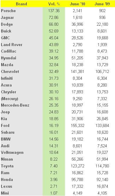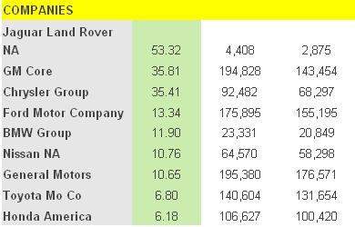 При Ford, Chevrolet и Toyota процентното увеличение не толкова голямо, но трите компании, по традиция са успели да реализират най-много возила на американския пазар. При компаниите, с най-добър процент са Jaguar Land Rover, които бележат 53.32% ръст.