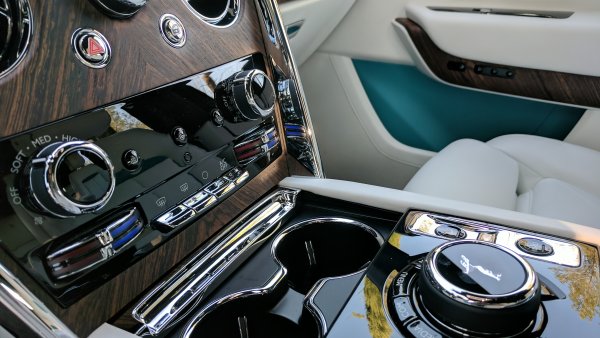 ОБЗАВЕЖДАНЕТО Е ТОЧНО КАКВОТО ОЧАКВАТЕ от най-луксозната марка в света: скъпо дърво, метал, първокласни кожи и колосален списък от възможности за персонализация. Като например тюркоазените нотки в нашата тестова кола, които се простират чак до ръчно изрисуваната линия отвън и до чадърите във вратите. Екстра са дори гумените стелки под краката ни - нещо нечувано досега за Rolls-Royce. Иначе стандартно бихте получили дебели килимчета от овча кожа.