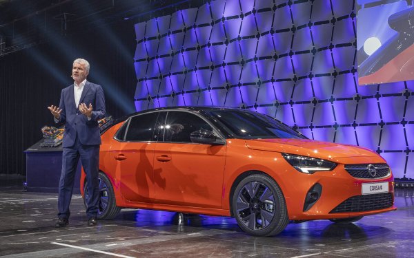 Главният изпълнителен директор на Opel Михаел Лошелер представя новата Corsa в Рюселсхайм. Със стартова цена от 29 900 евро за Германия, това ще е един от най-достъпните електромобили на европейския пазар