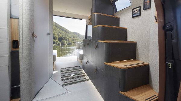Седалките в салона се въртят, както подобава на всеки сериозен кемпер. Под панорамното стъкло в задната част също има група седалки. Когато задната част бъде отворена, пространството отдолу се превръща в слънчева тераса с изваждащо се барбекю, в случай че риболовът се окаже успешен. Кухнята е икономично интегрирана под стълбата за спалнята, чиито стъпала са осветени със светодиоди.
