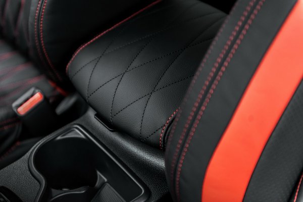 За интериора специалистите от Kahn Design избраха ватирана мека кожа с контрастен червен шев, с която са тапицирани предните и задните седалки. Със същата кожа е и централния подлакътник, както и много други елементи в салона. Специални фирмени релефни табелки на седалките допълват вида.