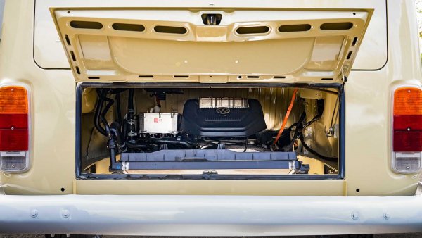 Сега Volkswagen of America предостави агрегата от един e-Golf на специализираната работилница EV West за вграждане в минибута Т2 (1967-1979 г.). Целта на тази задача е да се покажат възможностите на електрозадвижването за класически модели на VW. Резултатът: Т2 в цветове канзаско бежово и пастелно бяло. Очевидно става въпрос за автомобил от 1972 г. с големите стопове.