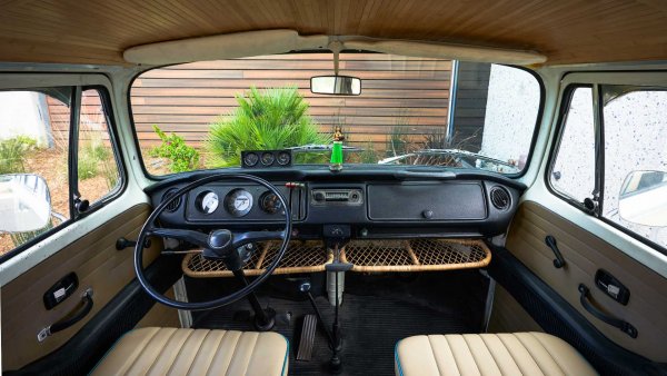 Повечето външни и вътрешни детайли на E-Bus остават непроменени. Серийният дълъг скоростен лост остава запазен, но сега задейства паркинг-позицията, задната предавка, неутрална, предна и регенеративните режими на автоматичната кутия. За запазването на автентичността на буса са оставени старите инструменти, но е поставен и цифров показател за електромобила, който дава информация за различни данни.