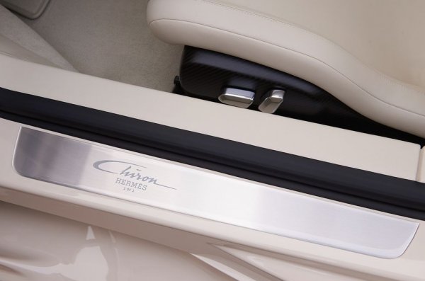 Всъщност цветът на този Chiron официално се нарича  Hermès Craie, като е избран от няколко варианта, предложение от компанията на клиента, който си е поръчал колата. Решетката на радиатора е във формата на подкова, като този елемент се среща в салона - на вратите и на централния тунел. Декоративните детайла са направени от смес от вълна и кашмир, а на консолата пред водача има надпис "Habillé par Hermès / Paris/ 1/1" (от френски език - облечен от Hermès).