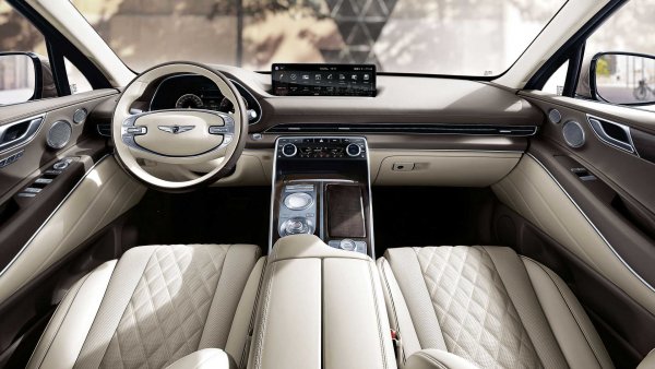 Интериорът на всъдехода е основан на прави линии и плавни изивки, които придават усещане за простор. Както се очакваше, GV80 е получил огромен монитор с диагонал 14,5 инча, който е комбиниран с цифров приборен панел. Умишлено създателите на всъдехода са свели механичните бутони и превключватели до минимум.