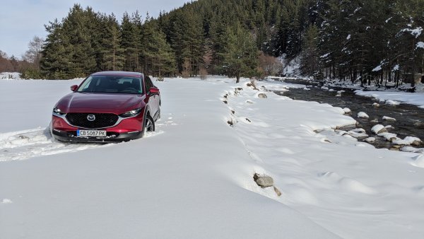 Базовата CX-30 е с предно предаване, но ние тестваме автомобил със задвижване на четирите колела. Електромагнитният многодисков съединител може да прехвърля до 50 процента от въртящия момент към задните колела и се допитва до сензорите 200 пъти в секунда, за да прецени кога да го направи. С едва 17.5 сантиметра просвет, тази Mazda не е офроуд звяр. Но в дълбокия сняг над Бели Искър не срещна абсолютно никакви затруднения.