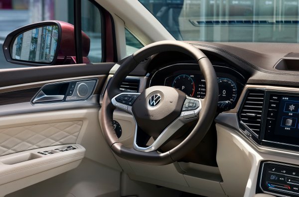 В салона за Teramont напомня само предния панел, докато сензорният блок на климатика и дефлекторите са оригинални. Като опция се предлага приборен панел с диагонал 10,25 инча, докато 9,2-инчовият тъч-скрийн на мултимедията влиза в базовото обоудване.