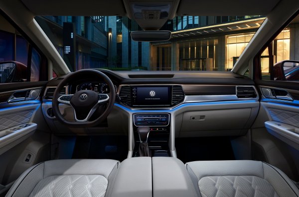 В салона за Teramont напомня само предния панел, докато сензорният блок на климатика и дефлекторите са оригинални. Като опция се предлага приборен панел с диагонал 10,25 инча, докато 9,2-инчовият тъч-скрийн на мултимедията влиза в базовото обоудване.