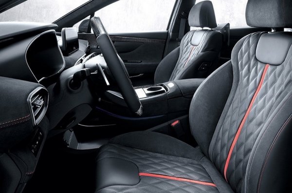 Интериорът на Santa Fe N Performance е украсен с алкантара, кожа и карбон. Поставени са и спортни седалки с допълнителна странична поддръжка и с червена ивица, която трябва да подчертае спортния характер на автомобила.