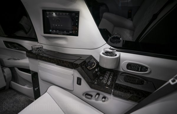 Cadillac Escalade ESV е удължен с 50 см и може да се използва в качеството на подвижен офис или на домашен киносалон. В автомобила е инсталирана аудиосистема 7.1 и 43-инчов екран екран Smart TV UHD. Салонът е оборудван с прибиращи се масички от японско дърво (ясен), големи кресла, електрически поставки да краката, малко барче и 12-инчов приборен панел а управление.