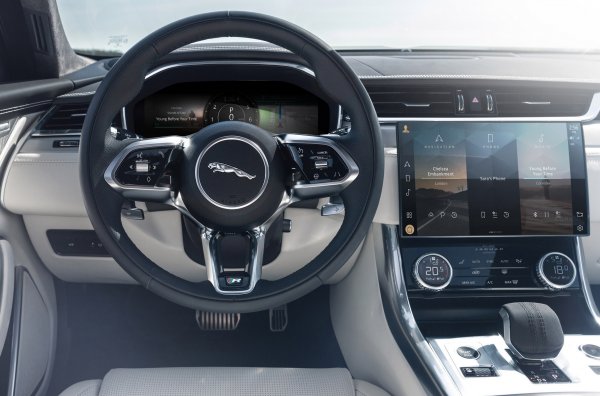 Затова пък салонът е напълно нов, като той на практика повтаря този на обновения F-Pace. Централно място в него заема извитият екран на мултимедийната система Pivi Pro с диагонал 11,4 инча. Устройството е с подобрена графика и с опростено меню, като има две SIM-карти (за паралелно качване на данни) и възможност за обновяване от разстояние.
