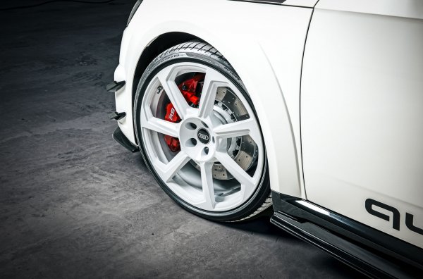 Юбилейната машина е в бял цвят Alpine, който препраща към състезателните модели на марката. Стилът на украсяване на каросерията препраща към специалната версия Audi Sport quattro S1, с която германската легенда в ралита Валтер Рьол печели победа в изкачването на Пайкс Пийк през 1987 година.