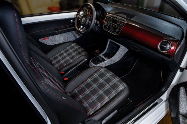 Връщайки се обратно в 21-ви век, интериорът на Up GTI е един от най-смелите и красиви сред класа си. Тартанът, в който са облечени седалките, червеното табло на пиксели и червените контрастни шевове на волана са изглежда точната формула да върнеш ретрото на мода. При това да изглежда сякаш е от колекция за този сезон.