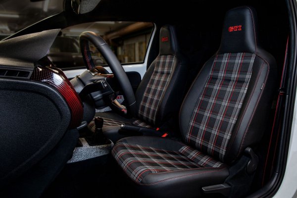 Връщайки се обратно в 21-ви век, интериорът на Up GTI е един от най-смелите и красиви сред класа си. Тартанът, в който са облечени седалките, червеното табло на пиксели и червените контрастни шевове на волана са изглежда точната формула да върнеш ретрото на мода. При това да изглежда сякаш е от колекция за този сезон.