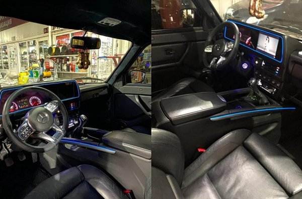 Модернизирана "Нива" с волан от новия Mercedes-AMG G 63, кресла от BMW E92 и мултимедийна система от Mercedes-Benz GL е изложена за продажба в Москва. Всъдеходът с 3 врати и пробег от 9500 км е оценен на 1,5 млн. рубли (около 16 000 евро), съобщава Auto.ru.