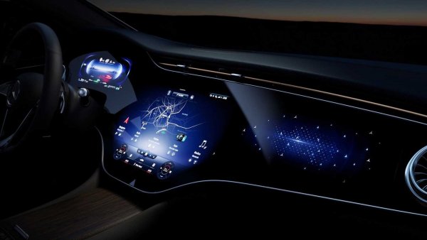 Ключовият детайл в интериора е хиперекранът MBUX Hyperscreen, чиято широчина е цели 141 см и на практика той заема целия преден панел. В него са свързани три екрана - 12,3-инчови за водача и пасажера до него, както и 17,7-инчов по средата. Над него минава тънък прорез на вентилацията, но основните дефлектори във вид на турбини са преместени в ъглите.