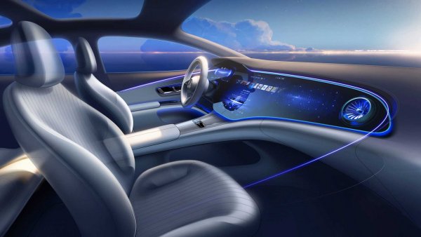 Екранът Hyperscreen е опция, базовият модел ще получи централна консола. Дисплеите имат тактилна обратна връзка - както при новата S-Class. За електромобила е предвиден и проекционен дисплей, който е направен от матрица с 1,3 млн. огледала и предлага качество на картината като на 77-инчов монитор.