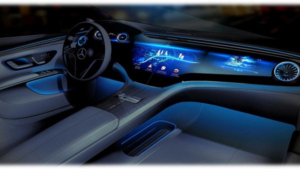 Екранът Hyperscreen е опция, базовият модел ще получи централна консола. Дисплеите имат тактилна обратна връзка - както при новата S-Class. За електромобила е предвиден и проекционен дисплей, който е направен от матрица с 1,3 млн. огледала и предлага качество на картината като на 77-инчов монитор.