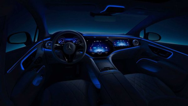 Ключовият детайл в интериора е хиперекранът MBUX Hyperscreen, чиято широчина е цели 141 см и на практика той заема целия преден панел. В него са свързани три екрана - 12,3-инчови за водача и пасажера до него, както и 17,7-инчов по средата. Над него минава тънък прорез на вентилацията, но основните дефлектори във вид на турбини са преместени в ъглите.
