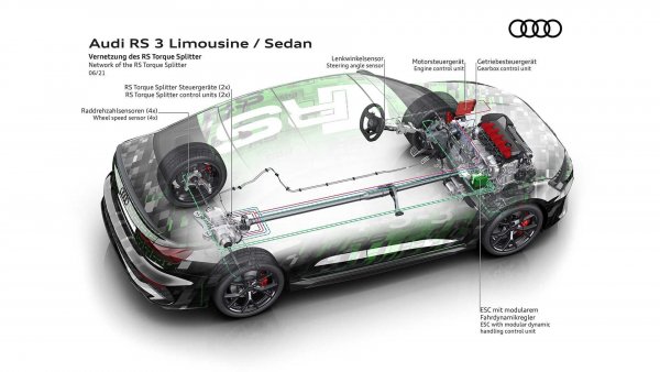 Една от основните разлики при новото RS3 спрямо предшественика му е усъвършенстваната система за задвижване на четирите колела. Тя е взаимствана от хот-хеча VW Golf R, базиран на осмото поколение на модела с 5 врати. В Audi са решили да се откажат от традиционната многодискова муфа за предаване на тягата на втората ос, като са я заменили с две подобни устройства – по едно на всеки от задвижващите валове на задните колела.