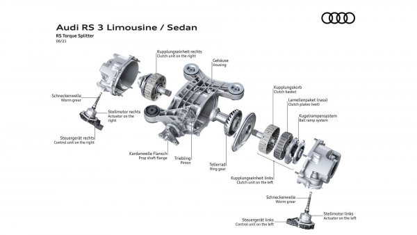Една от основните разлики при новото RS3 спрямо предшественика му е усъвършенстваната система за задвижване на четирите колела. Тя е взаимствана от хот-хеча VW Golf R, базиран на осмото поколение на модела с 5 врати. В Audi са решили да се откажат от традиционната многодискова муфа за предаване на тягата на втората ос, като са я заменили с две подобни устройства – по едно на всеки от задвижващите валове на задните колела.