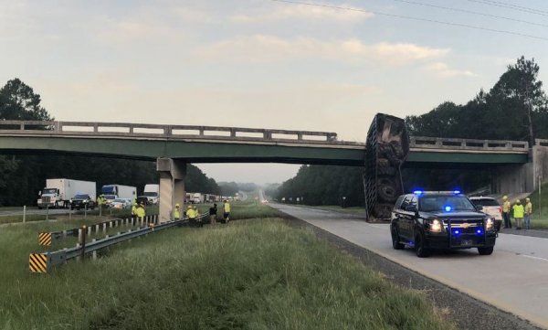 Тежка, но и куриозна катастрофа затвори натоварен път в американския щат Джорджия преди дни. Огромен самосвал се врязал в естакада на шосето I-16, като в резултат на удара пътното съоръжение се изместило с почти 2 метра (183 см). Инцидентът се е случил късно през нощта и за щастие няма пострадали.